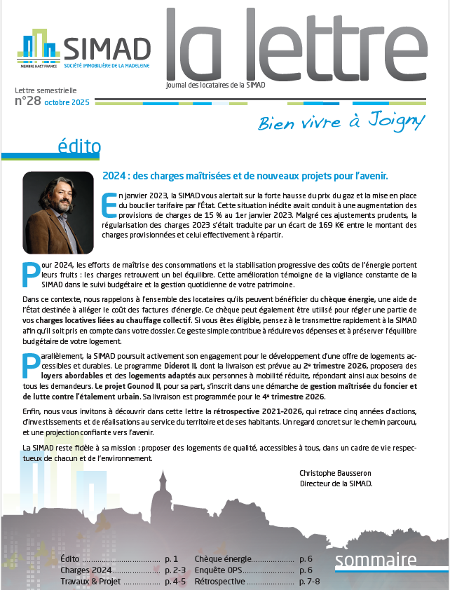 La SIMAD a mis en place une lettre d’informations pour vous, les locataires. Vous y trouvez des infos pratiques, l’actualité des travaux en cours et à venir, les projets divers mais également les budgets, les nouveautés du quartier, etc.
